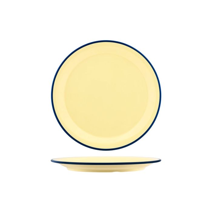 - JAB VINTAGE YELLOW/BLUE RIM ENAMEL LOOK ROUND PLATE 255mm (*49921*) = PACK OF 6 X EACHES