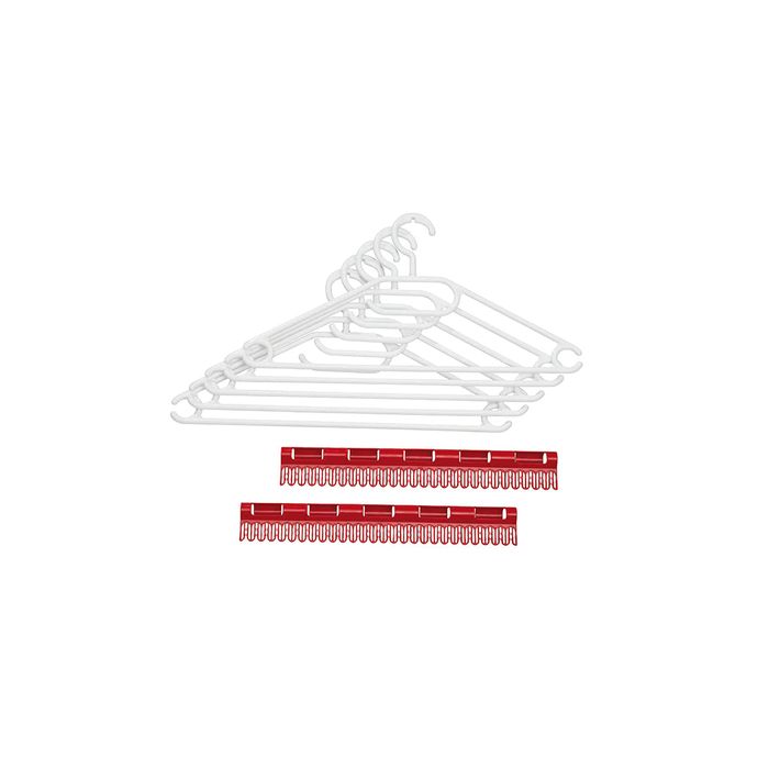 The practical accessories set for Leifheit laundry dryers Pegasus and Condor: it contains two holders for small items, to clamp up to 54 small articles like socks, handkerchiefs or pants – completely without laundry pins. Also practical are the five wind proof hangers. While hanging up they click home due to a small carving. Even by strong winds they do not fall off the bars.