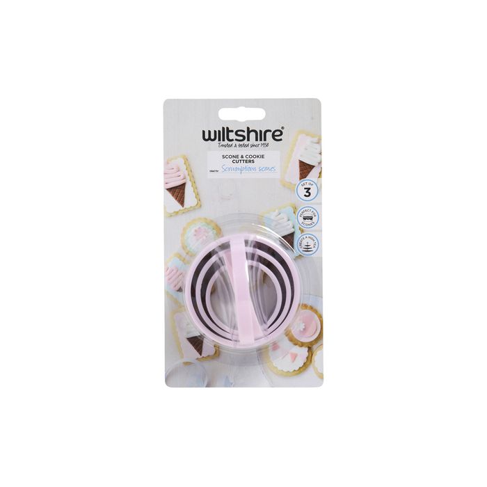 Wiltshire Scone Cutters 3pc Set are ideal for making scrumptious scones! Beautifully finished in pastel pink, set come in 3 sizes so you can adjust what you are baking, they are easy to clean so there is no mess or fuss and they nest for easy storage.