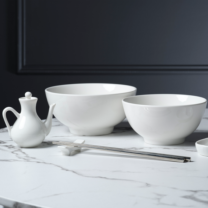 Made of clay that's malleable and great for forming detailed shapes. Created in a two firing process where it becomes vitrified during the second firing, making porcelain an extremely durable dinnerware option that is dishwasher, microwave, and oven safe.