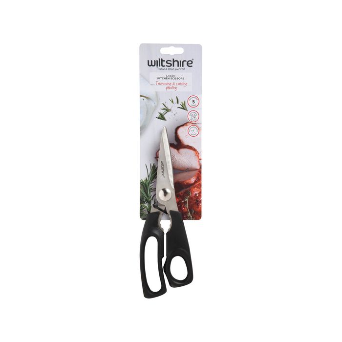 Wiltshire Kitchen Shears are ideal for trimming and cutting poultry. Featuring Polypropylene Handle, Stainless Steel Laser Edge Blade. Blades do not require sharpening.