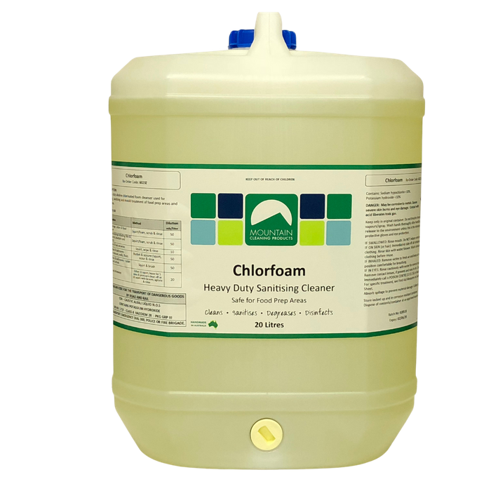Chlorfoam® is a heavy-duty chlorinated cleaner and sanitising agent with a double action formula that breaks down dirt, fat, grime and proteins and kills residual bacteria and mould.