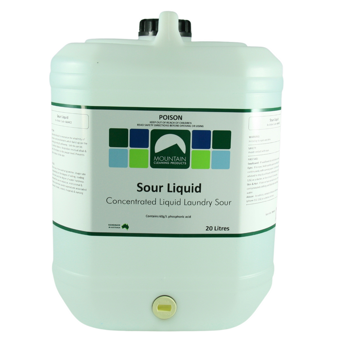 Sour Liquid is part of Mountain’s commercial laundry range that caters for a wide spectrum of commercial, institutional and industrial soils and suits on-premises laundries in hotels, motels, care facilities, salons and spas, and commercial laundries with automatic or manual dispensing systems.