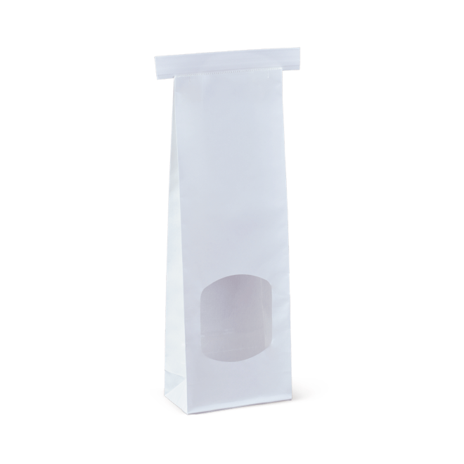 Retail Tin Tie Window bags are poly-lined for freshness, and feature a window to showcase the contents. They're ideal for dry foods like coffee beans, loose leaf tea, biscuits, and nuts, and can be sealed with a bar heater. Polylining is 100% BPA-free. The Small tin-tie bag can also be resealed with the tin-tie, and is offered in white.